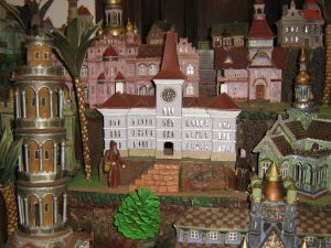 Modely některých dodnes stojících reálných budov, ať už z Čech nebo z celého světa, pan Dlouhý vyráběl podle pohlednic. Většinu budov opatřil stručnými, ručně psanými popiskami s názvem, datací, svým jménem i adresou, které jsou vlepeny do vnitřní části. Někde nechybí ani razítko na spodní části. Jako první vytvořil symbol Českého ráje zříceninu hradu Trosky (1907), poté Palác dámského oboru v americkém Chicagu (1908), Palác lodního umění tamtéž (1909), Národní muzeum v Praze (1909), Šikmou věž v italské Pisse (1909), vojenskou střelnice v Bradlecké Lhotě (1910), Rychtrův Kotva pavilon (1911), vodní a větrný mlýn (1913), Mírový palác v holandském Haagu (1914), kde je dokonce zmínka o probíhající světové válce, kostel Bratří nejsvětější svátosti v Českých Budějovicích (1914), rezidenci Řeckoorientálského arcibiskupství v Černovicích v Bukovině (1915), Řezníčkovu vilu pod Hrubou Skálou (1918) a hlavní bránu Vysokého Mýta. Nechybí ani lomnická radnice, kterou návštěvníci mohou vidět v celé své kráse i v originále přímo z okna muzea. Betlém obsahuje také další přesně neidentifikované modely, ať už je to dům s cimbuřím a věží s hodinami, různé paláce, kostely a osm roubenek, ukázky lidové architektury zdejšího kraje. K betlému byly v minulosti přidány modely zámku Hluboká a Windsor v Anglii, jež jsou pravděpodobně dílem některého jiného betlémáře. Budovy jsou rozmístěny v sedmi různě odstupňovaných patrech. Členitá krajina je tvořena z kůry, mechu, šišek, zkamenělých dřev a kamenů z různých lokalit, ať už u nás nebo i z ciziny, např. z řady poutních míst jako je lomnická hora Tábor, podkrkonošský Bozkov, chodský Svatý Vavřineček, španělský Monsserat, polský Krzesów, dále z Velhartic, hory Čerchov, Domažlic, Rýchor, Stachelbergu, Dračího jezera v Bavorsku atd.